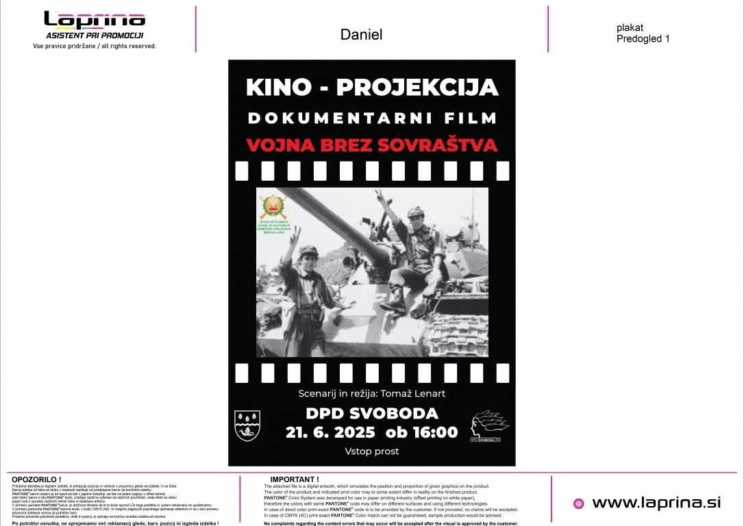 Konec meseca junija 2025 so v Žireh praznovali občinski praznik. Organizirali smo srečanje vseh vojnih veteranov za Slovenijo iz Žirov. Srečanja se je udeležil tudi župan Žirov, ki je prisotne lepo pozdravil in nagovoril. Izkoristili smo priložnost in predvajali film, ki je na koncu požel veliko aplavza in odobravanja. Župan je na koncu povzel besede, da bi ta film moral videti vsak Slovenec.